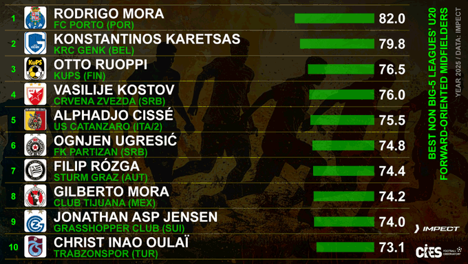 Συγκεκριμένα, ο ποδοσφαιριστής της Γκενκ βρίσκεται στη 2η θέση στην κατηγορία των επιθετικογενών μέσων, πίσω μόνο από τον Ροντρίγκο Μόρα της Πόρτο, ενώ ο παίκτης του Ολυμπιακού είναι 3ος στην κατηγορία των “ολοκληρωμένων μέσων”, αυτών δηλαδή που μπορούν να προσφέρουν και στην επίθεση και στην άμυνα.