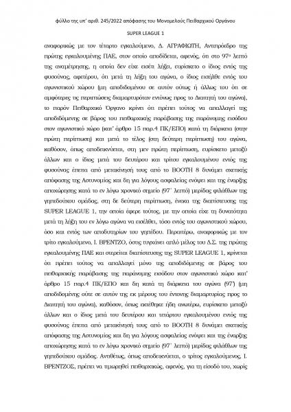 Απόφασης με την οποία ο αντιπρόεδρος του Ολυμπιακού, Κώστας Καραπαπάς, τιμωρήθηκε με απαγόρευση εισόδου στα γήπεδα για 6 μήνες και το μέλος του του ΔΣ της «ερυθρόλευκης» ΠΑΕ Γιάννης Βρέντζος με απαγόρευση εισόδου στα γήπεδα για 3.5 μήνες.
