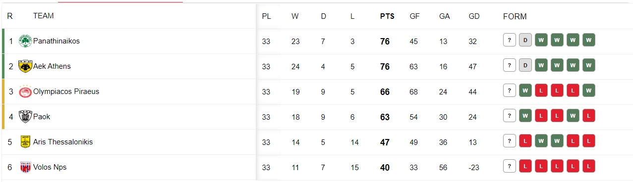 Ο Παναθηναϊκός εξακολουθεί να διατηρεί τον πρώτο λόγο για την κατάκτηση του πρωταθλήματος, υπερτερώντας της ΑΕΚ στην ισοβαθμία. Πριν από λίγες ημέρες (23/4) η ομάδα του Ιβάν Γιοβάνοβιτς πέρασε «δια πυρός και σιδήρου» από τη Θεσσαλονίκη (1-2) και ευελπιστεί να ντουμπλάρει τις νίκες της στα Play Off επί του ΠΑΟΚ. Οι «πράσινοι» έφτασαν τα 13 ματς αήττητοι (9-4-0 με 17-2 τέρματα) ωστόσο στο Κύπελλο είχαν αποκλειστεί από τους «ασπρόμαυρους». Η ομάδα του Ραζβάν Λουτσέσκου, από την άλλη, πήρε το ντέρμπι κόντρα στον Άρη (3-2), επιστρέφοντας στις επιτυχίες έπειτα από δυο σερί ήττες και παραμένει στο κατόπι του Ολυμπιακού για την τρίτη θέση.