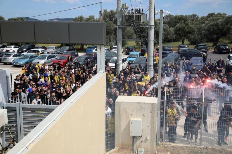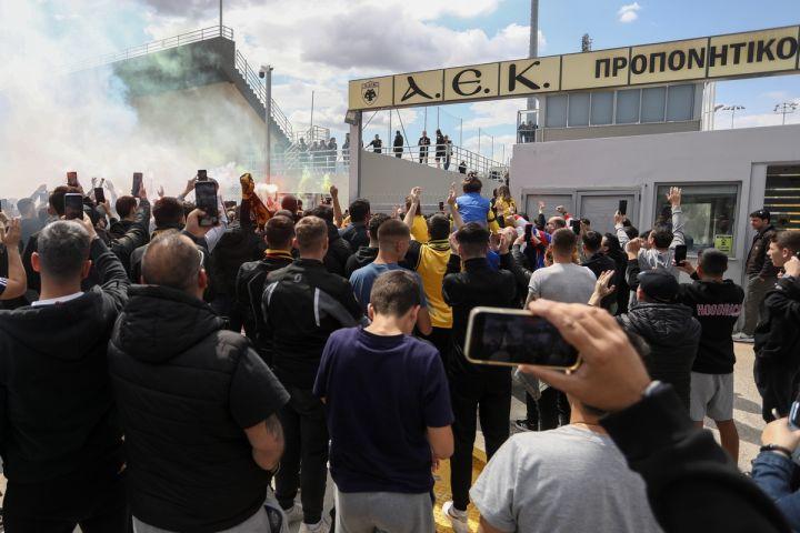 Οπαδοί της ΑΕΚ συγκεντρώθηκαν έξω από το προπονητικό κέντρο της ομάδας στα Σπάτα. Το αρχικό σχέδιο ήταν να "ντοπάρουν" τους παίκτες ενόψει του κρίσιμου αγώνα για τον τίτλο με τον Άρη στο Κλεάνθης Βικελίδης, ωστόσο αναβλήθηκε και οι κιτρινόμαυροι παρέμειναν στη βάση τους.