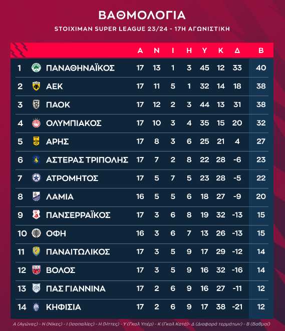 Τα σπουδαιότερα παιχνίδια της 17ης αγωνιστικής ολοκληρώθηκαν μετά τη λήξη του ντέρμπι στο "Γ. Καραϊσκάκης" όπου η ΑΕΚ επικράτησε με 2-1 του Ολυμπιακού και ανέβηκε στη δεύτερη θέση, στο -2 από τον Παναθηναϊκό.
