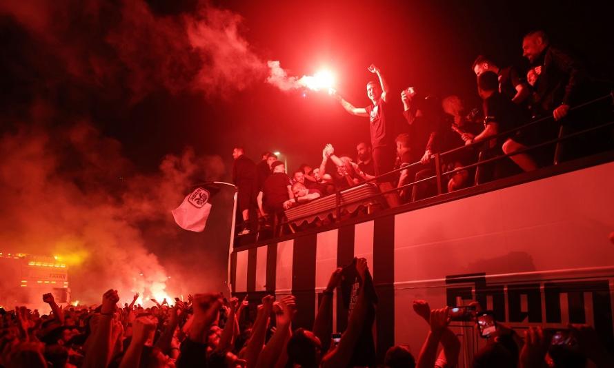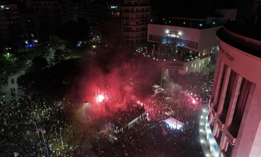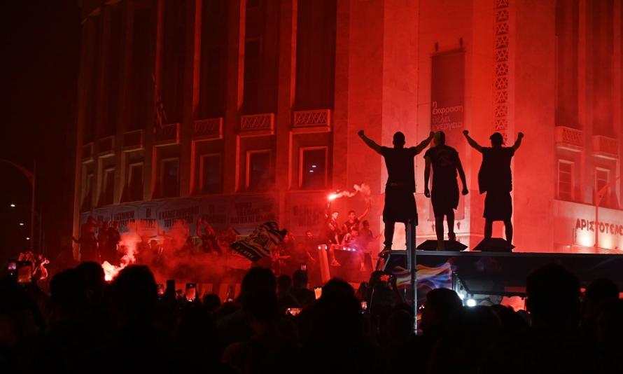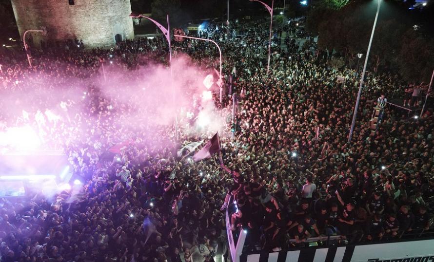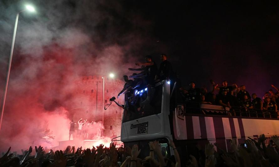 Σε μια νύχτα που μετατράπηκε σε ημέρα από τα βεγγαλικά και τα καπνογόνα, ο «ασπρόμαυρος» λαός πανηγύρισε με την ψυχή του σε ολόκληρη τη Θεσσαλονίκη σε μια πορεία από το Χαριλάου ως το γήπεδο της Τούμπας αποθεώνοντας τους πρωταθλητές Ελλάδας.
