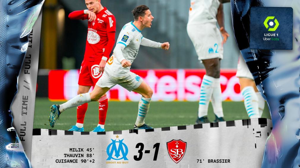 Η Μαρσέιγ κατάφερε να πάρει μια δύσκολη νίκη με 3-1 στο Βελοντρόμ της Μασσαλίας απέναντι στην Μπρεστ, για την 29η αγωνιστική της γαλλικής Ligue 1 κι έτσι να ανεβεί στην 5η θέση της κατάταξης με 45 βαθμούς. Η ομάδα του Σαμπάολι προηγήθηκε με τον Μίλικ στις καθυστερήσεις του πρώτου ημιχρόνου (45+1΄), ενώ στο 71΄ ισοφάρισαν οι φιλοξενούμενοι με τον Μπρασιέ. Τους τρεις βαθμούς της νίκης πήρε η Μαρσέιγ χάρη σε δύο τέρματα που σημείωσαν προς το τέλος του αγώνα, ο Τοβάν στο 88΄ και ο Κιζάνς στο τρίτο λεπτό των καθυστερήσεων (90+3΄).