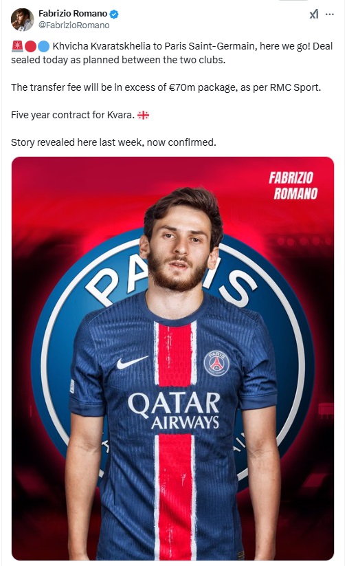 Σημειώνεται πως η ομάδα του ιταλικού Νότου είχε αποκτήσει τον Κβαρατσχέλια το καλοκαίρι του 2022 από την Ντιναμό Μπατούμι έναντι 13.300.000 ευρώ, με τον 23χρονο Γεωργιανό μεσοεπιθετικό να μετράει 30 γκολ σε 107 συμμετοχές σε όλες τις διοργανώσεις στα 2,5 χρόνια παρουσίας του στο "Ντιέγκο Αρμάντο Μαραντόνα" με την Νάπολι.