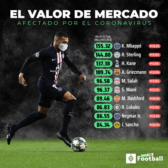 Ο πρωτοπόρος Κιλιάν Μπαπέ σημείωσε πτώση 19,2%. Ο 2ος στην δεκάδα Ραχίμ Στέρλινγκ 11,9%. Ο Χάρι Κέιν 11,6% και συνιστούν την τριάδα που έμεινε αμετακίνητη στο βάθρο πριν και μετά την πανδημία. Ωστόσο, υπήρξαν σημαντικές ανακατατάξεις, με τον Σαλάχ να είναι ο μόνος που ανέβηκε δύο θέσεις, τον Τζέιντον Σάντσο να «κλέβει» τη θέση του Μπόμπι Φιρμίνο στη δεκάδα και τον Νεϊμάρ να υποχωρεί μεν ένα νούμερο, χάνοντας δε πάνω από το 1/5 της μέχρι πρότινος αξίας του. Την ίδια ώρα, ο Πάουλο Ντιμπάλα, ο πιο διακεκριμένος παίκτης που έδειξε θετικός στον κορονοϊό, σημείωσε εμφανή πτώση του 12%, αν και έτσι κι αλλιώς δεν κατείχε θέση στα πρώτα 10 ονόματα.