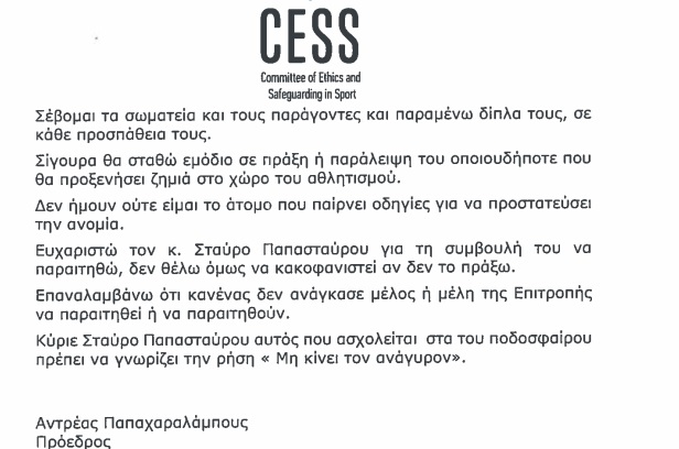 Απάντησε στον πρόεδρο της Ομόνοιας Σταύρο Παπασταύρου, ο προέδρος της Επιτροπής Δεοντολογίας Ανδρέα Παπαχαραλάμπους, σχετικά με τις καταγγελίες του κ. Παπασταύρου για τις παραιτήσεις των τριών Μελών της Επιτροπής Δεοντολογίας.