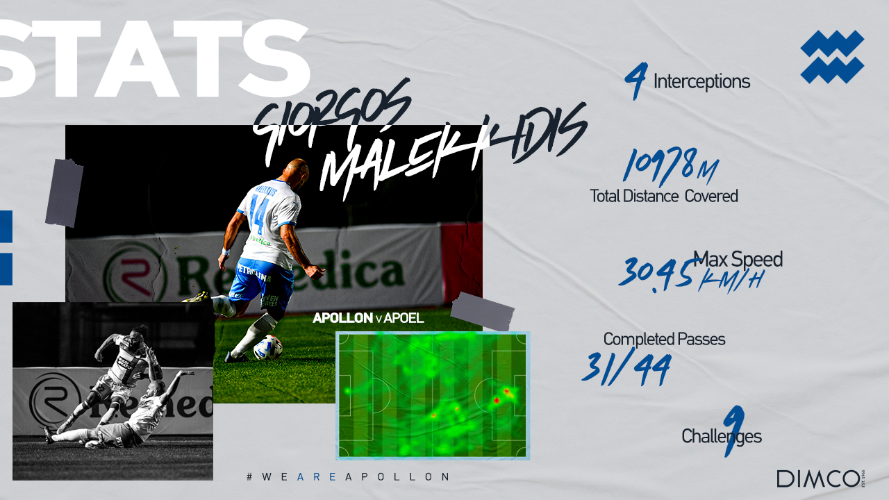 Ο Γιώργος Μαλεκκίδης πραγματοποίησε το ντεμπούτο του στο ντέρμπι με τον ΑΠΟΕΛ, στην επιστροφή του στον Απόλλωνα, με τη λεμεσιανή ομάδα, να δημοσιεύει τα στατιστικά στο πρώτο του φετινό παιχνίδι.