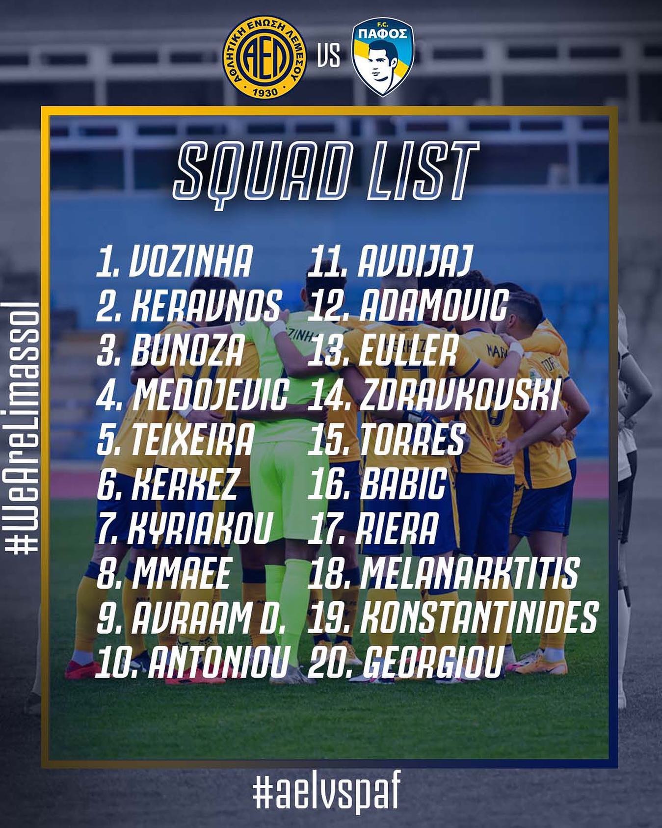 Με απογευματινή προπόνηση ολοκληρώθηκε η προετοιμασία της ΑΕΛ για τον αυριανό αγώνα με την Πάφο. Μέσα ο Ριέρα, εκτός αποστολής ο Ντανίλο. Εκτός και οι Παπαφώτης-Αβραάμ, ο τιμωρημένος Σάντος και ο νεοαποκτηθείς Πσισιέ.