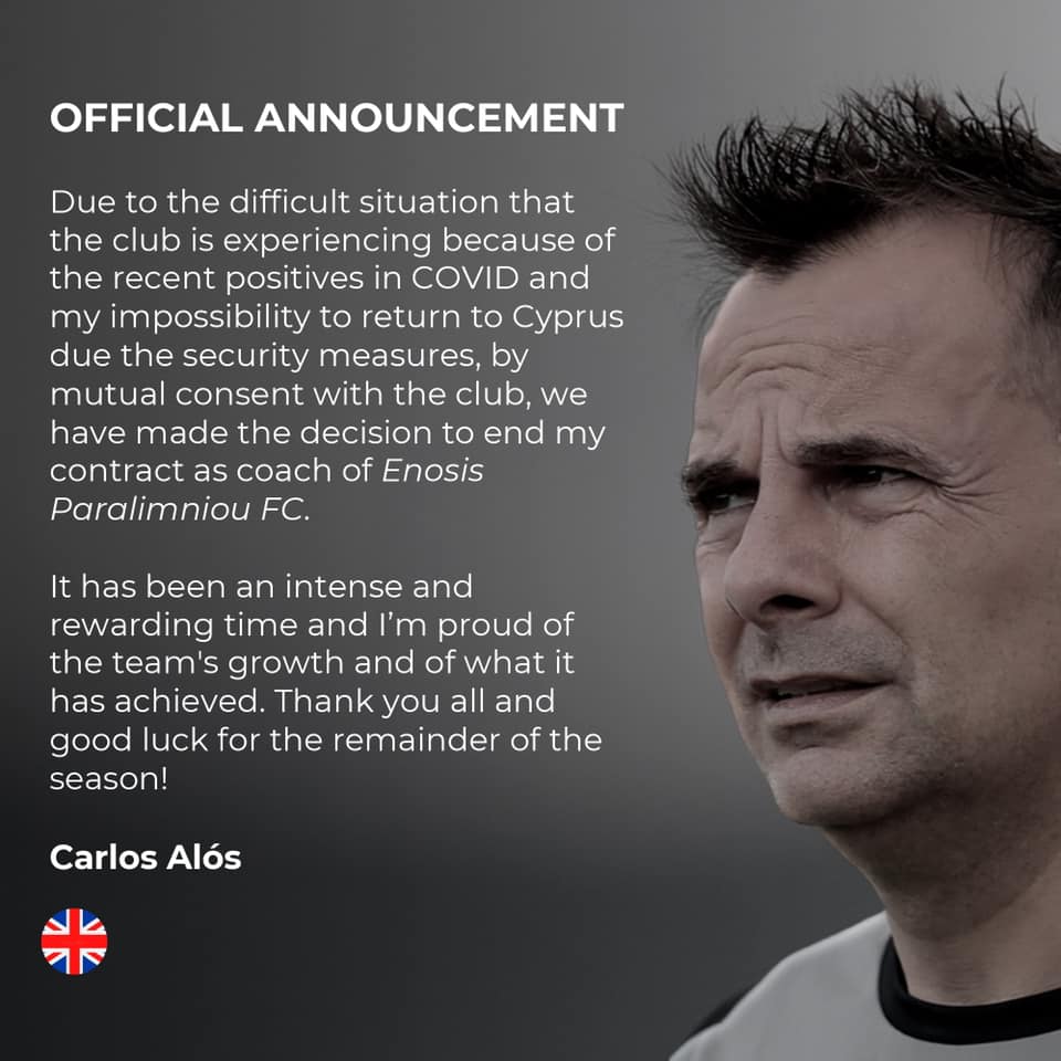 «Λόγω της δύσκολης κατάστασης που βιώνει ο σύλλογος λόγω των θετικών κρουσμάτων και της αδυναμίας μου να επιστρέψω στην Κύπρο λόγω των μέτρων ασφαλείας, κατόπιν κοινής συναίνεσης με τον σύλλογο, πήραμε την απόφαση να τερματίσουμε την συνεργασίας μας με την ΕΝΠ. Ήταν έντονος και ικανοποιητικός ο χρόνος μου και είμαι περήφανος για την ανάπτυξη της ομάδας και για το τι πετύχαμε. Σας ευχαριστώ όλους και καλή συνέχεια στο υπόλοιπο της σεζόν».