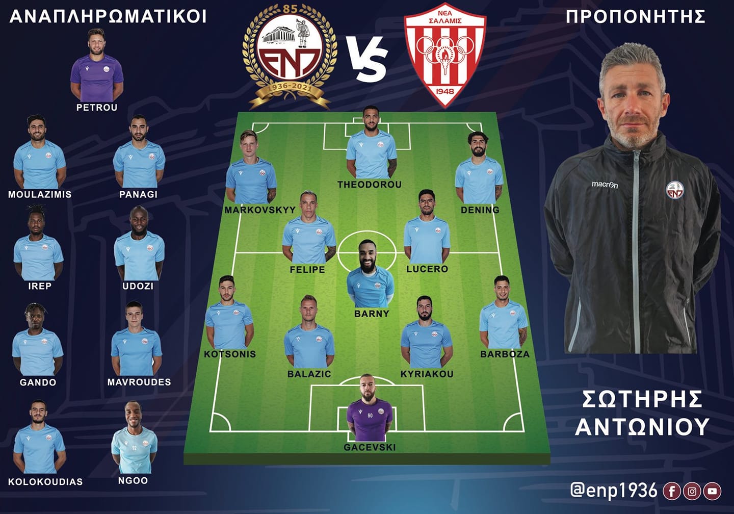 ΕΝΠ (4-3-3): Γκατσέφσκι - Μπαρμπόσα, Κυριάκου, Μπάλαζιτς, Κοτσώνης - Μπάρνι - Λουσέρο, Φελίπε - Ντένινγκ, Μαρκόφσκι - Θεοδώρου.