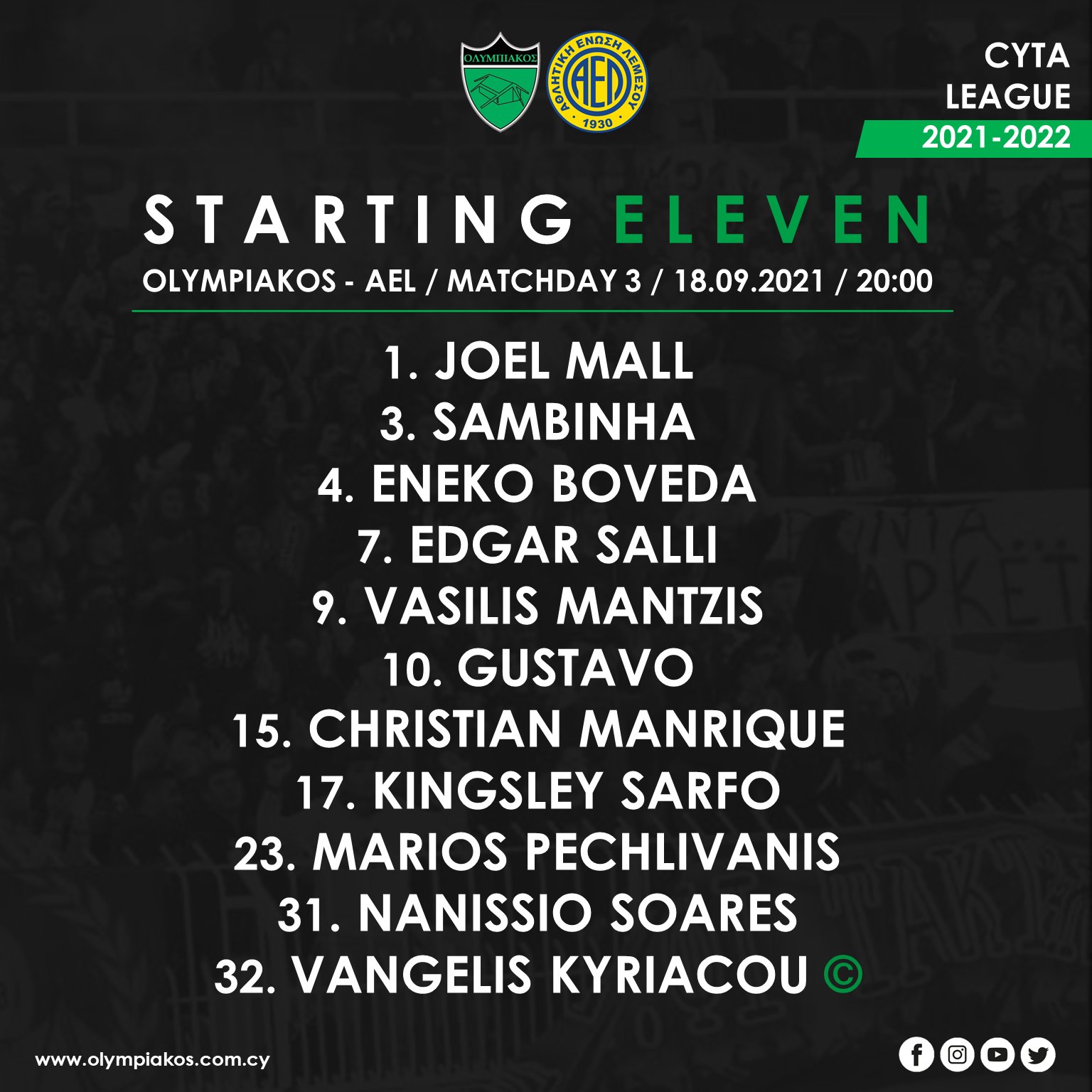 Η 11άδα του Ολυμπιακού: Μαλ - Κυριάκου, Μποβέδα, Σαμπίνια, Μανρίκε - Νάνι - Σαρφό, Γκουστάβο - Σάλι, Πεχλιβάνης - Μάντζης.