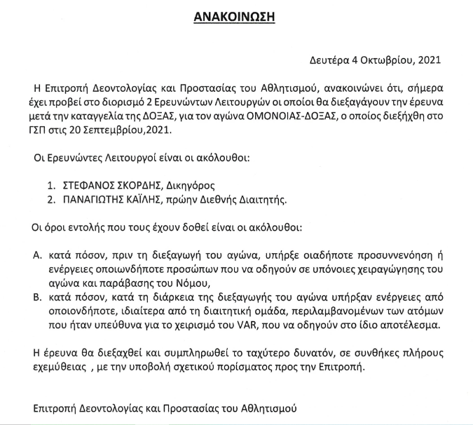 Η Επιτροπή Δεοντολογίας και Προστασίας του Αθλητισμού ανακοίνωσε το διορισμό δυο Ερευνώντων Λειτουργών , οι οποιοι θα εξετάσουν την καταγγελία της Δόξας για τον αγώνα με την Ομόνοια.