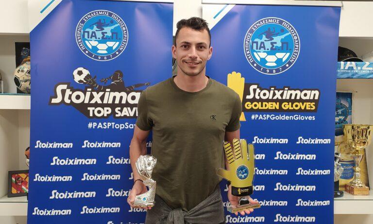 Δύο βραβεία παρέλαβε ο τερματοφύλακας του Εθνικού Άχνας, Ανδρέας Χριστοδούλου, από τον ΠΑ.Σ.Π. τις προηγούμενες μέρες. Πρόκειται για το βραβεία Stoiximan Golden Gloves του Β’ Γύρου της πρώτης φάσης του Πρωταθλήματος και Stoiximan Top Save της 20ης Αγωνιστικής.