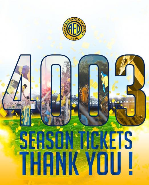 Στην ΑΕΛ επικρατεί μεγάλος ενθουσιασμός και περηφάνια, όπως και αρκετή ικανοποίηση με τον κόσμο της ομάδας να σπάει άλλο ένα ρεκόρ. Η ομάδα της Λεμεσού ενημέρωσε ότι ξεπεράστηκε σήμερα και το φράγμα των 4003 εισιτηρίων διαρκείας, ένας στόχος που έθεσε η διοίκηση τις προάλλες. Επόμενος στόχος τώρα για την ΑΕΛ είναι τα 4333 εισιτήρια διαρκείας!
