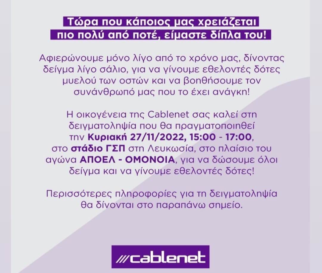 Πριν την έναρξη του σημερινού (27/11) σπουδαίου ντέρμπι ανάμεσα σε ΑΠΟΕΛ και Ομόνοια, η Cablenet θα πραγματοποιήσει δειγματοληψία για να γίνει περισσότερος κόσμος δότες μυελού των οστών.