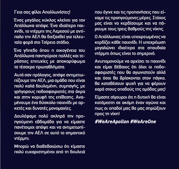 Οι δηλώσεις από τον προπονητή του Απόλλωνα Κωνσταντίνο Μακρίδη στο πρόγραμμα αγώνα για την 13η αγωνιστική του πρωταθλήματος Cyta με αντίπαλο την ΑΕΛ. Ο Κύπριος τεχνικός μιλά για το σημερινό τελευταίοα ματς του Απόλλωνα στο Τσίρειο ως γηπεδούχος ομάδα, τις ιδιαιτερότητες του ντέρμπι αλλά και ότι οι πρωταθλητές είναι υποχρεωμένοι να κερδίζουν σε κάθε παιχνίδι.