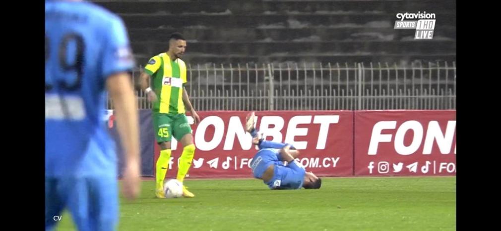 Άμεσα μπήκε στον αγωνιστικό χώρο το ιατρικό επιτελείο της ομάδας. Ο ποδοσφαιριστής δεν μπόρεσε να συνεχίσει τον αγώνα και πέρασε εκτός με το φορείο και στη θέση του πέρασε ο Χαραλάπους.