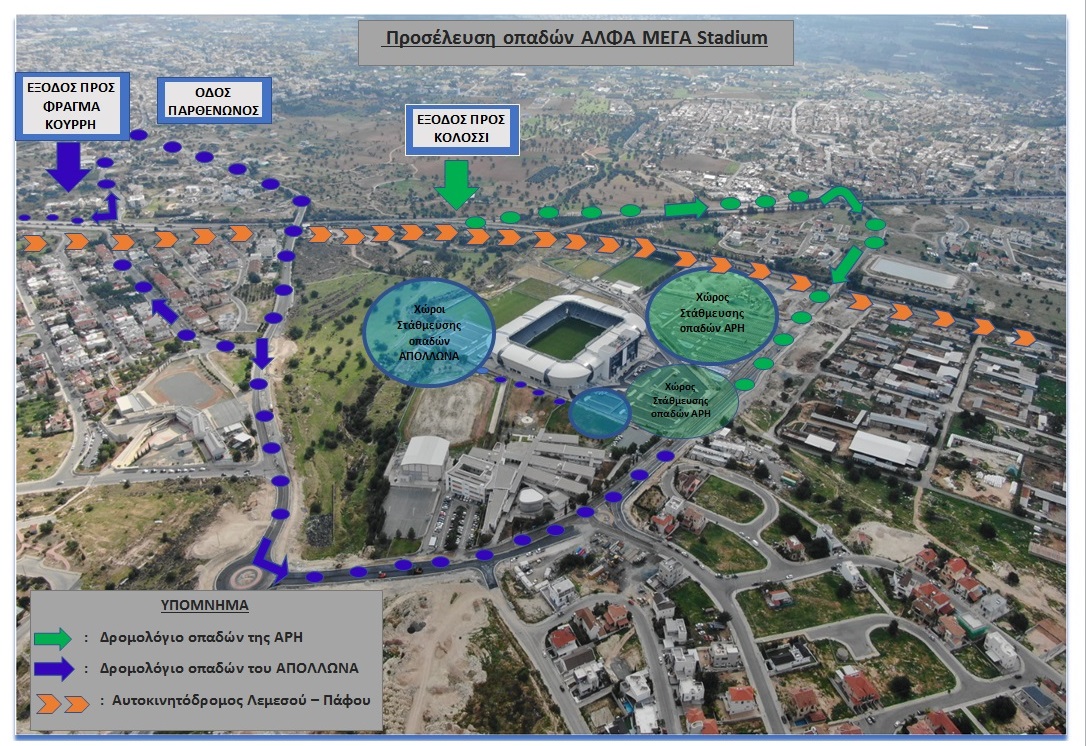Για την ομαλή προσέλευση και αποχώρηση των οπαδών του ΑΠΟΛΛΩΝΑ προς και από το στάδιο, καλούνται να κατευθυνθούν προς ΑΛΦΑΜΕΓΑ Stadium, δια μέσου του αυτοκινητόδρομου {Α6} προς Πάφο, έξοδο προς φράγμα Κούρρη και στη συνέχεια μέσω της οδού Παρθενώνος (1ο στρίψιμο δεξιά). Ακολούθως από τη 1η έξοδο {αριστερά} του νέου κυκλικού κόμβου, κατεύθυνση προς το γήπεδο. Οι φίλαθλοι του ΑΠΟΛΛΩΝΑ μπορούν να σταθμεύσουν στους προκαθορισμένους χώρους του γηπέδου για τους φιλοξενούμενους.