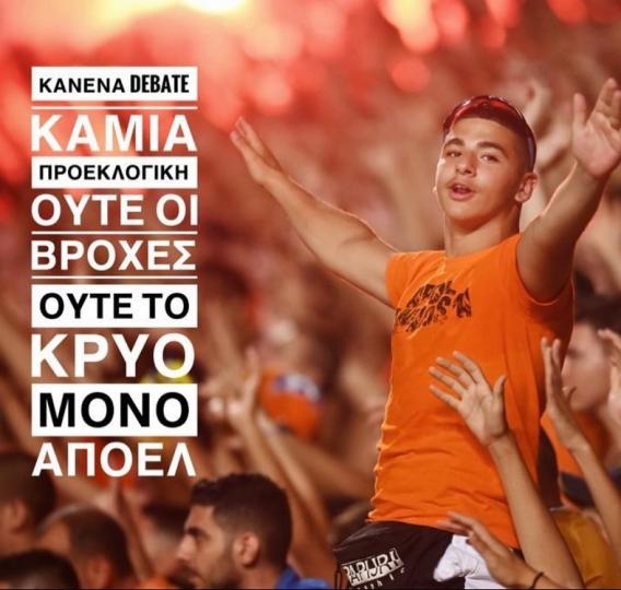 «Κανένα debate, καμία προεκλογική, ούτε οι βροχές, ούτε το κρύο, Μόνο ΑΠΟΕΛ. Ραντεβού στο ΓΣΠ, ΑΠΟΕΛ υπεράνω όλων» το μήνυμα.