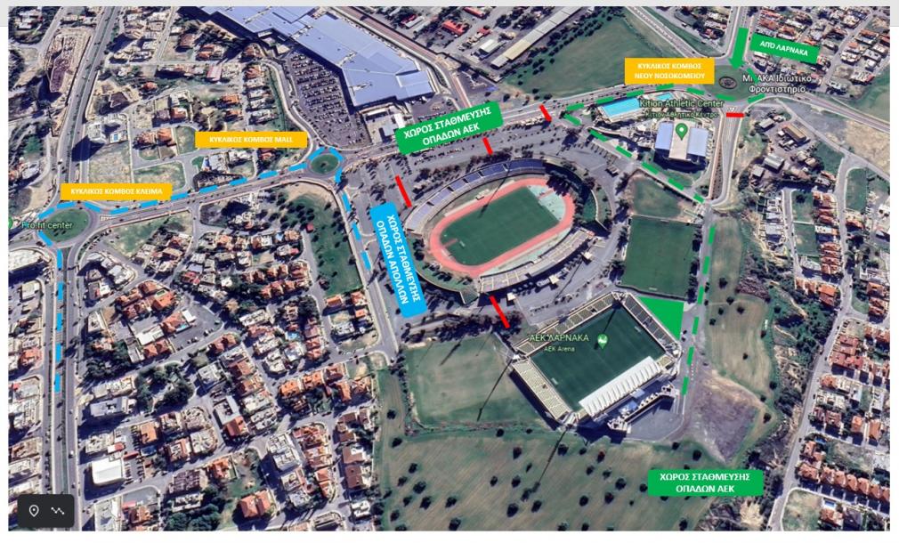 Από εκεί να κατευθύνονται προς το κολυμβητήριο και μετά αμέσως αριστερά και να σταθμεύουν ανατολικά και νότια του χώρου στάθμευσης του σταδίου ΓΣΖ και Νοτιοδυτικά του σταδίου ΑΕΚ ΑΡΕΝΑ.