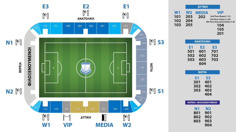 Η είσοδος τους στη δυτική κερκίδα για τα διαζώματα 104, 105 και 201 μπορεί να γίνει από την είσοδο των VIP η οποία βρίσκεται ανάμεσα στη βόρεια και την κεντρική είσοδο όπως σημειώνεται στο πιο κάτω σχεδιάγραμμα.