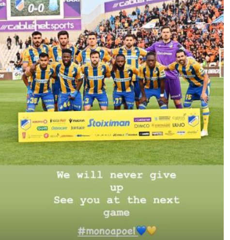 Πιο συγκεκριμένα ανέβασε μια φωτογραφία και έγραψε «Δεν θα τα παρατήσουμε ποτέ. Θα σας δούμε στο επόμενο παιχνίδι. Μόνο ΑΠΟΕΛ».
