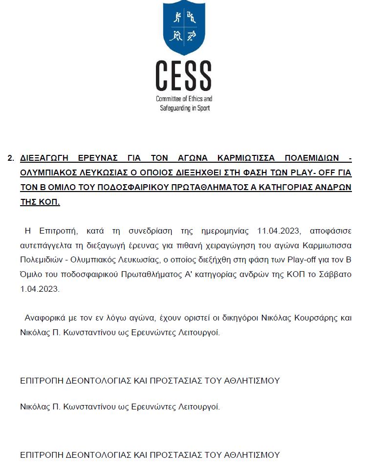 Tη διεξαγωγή έρευνας για πιθανή χειραγώγηση του αγώνα Καρμιώτισσα-Ολυμπιακός ο οποίος διεξήχθη την 1η Απριλίου για την 3η αγωνιστική του β' γκρουπ των πλέι οφ (νίκησαν 2-0 οι μαυροπράσινοι), ανακοίνωσε η Επιτροπή Δεοντολογίας και Προστασίας του Αθλητισμού.