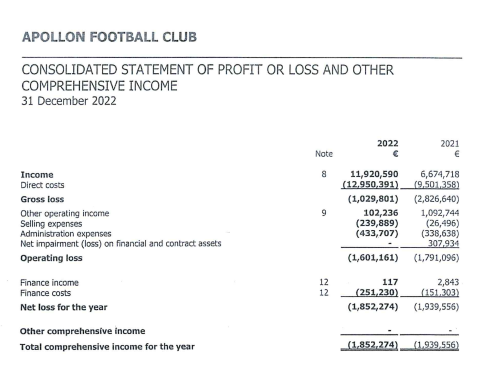 Μέσα από τις οικονομικές καταστάσεις που ανακοίνωσε η ΚΟΠ, έγινε γνωστό πως ο Απόλλωνας έκλεισε το 2022 με ζημιά 1,8 εκατομμύρια.