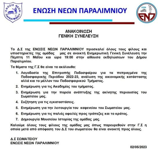 Φωτογραφία: Υπενθύμιση για την Γενική Συνέλευση Α' ΚΑΤΗΓΟΡΙΑ ΕΝΠ 11.05.202315:08 Η ΕΝΠ ενημερώνει για την Γενική Συνέλευση που θα γίνει στις 11/5 στις 19:00. Πάει για Ασένσιο και Πάου Τόρες η Άστον Βίλα Αναλυτικά: 1_415.jpg