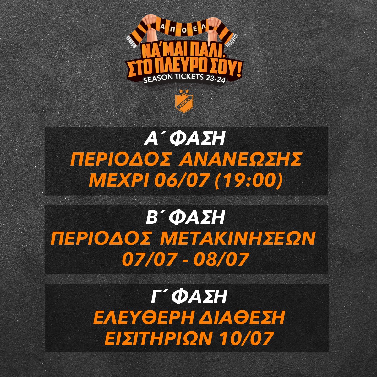 Ο ΑΠΟΕΛ υπενθυμίζει ότι αύριο είναι η τελευταία μέρα για το δικαίωμα ανανέωσης, των περσινών κατόχων διαρκείας. Όσοι ανανεώσουν επωφελούνται έκπτωσης 10%.