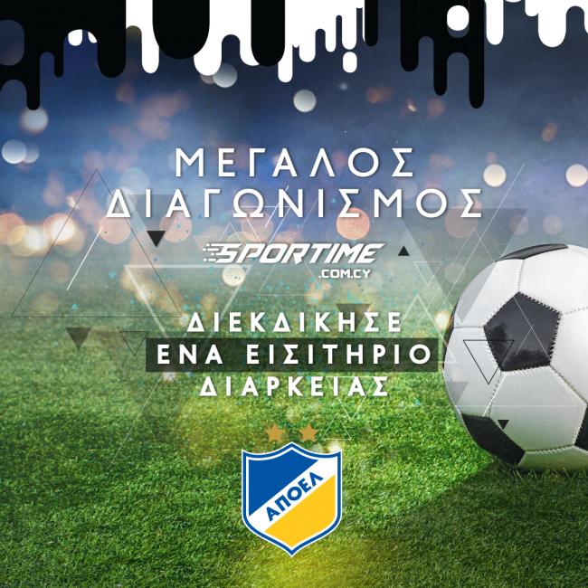Το Sportime σας χαρίζει μια μοναδική ευκαιρία! Συμμετέχοντας στον μεγάλο μας διαγωνισμό, μπορείτε να κερδίσετε ένα εισιτήριο διαρκείας για τους αγώνες του ΑΠΟΕΛ για το υπόλοιπο της σεζόν.