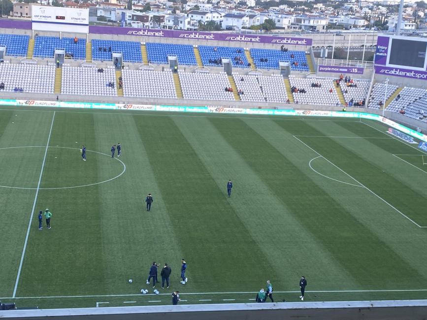 Λίγο πριν την ανακοίνωση της εντεκάδας, έκανε και ο ΑΠΟΕΛ την πρώτη του βόλτα στον αγωνιστικό χώρο πριν την καθιερωμένη προθέρμανση της ομάδας.