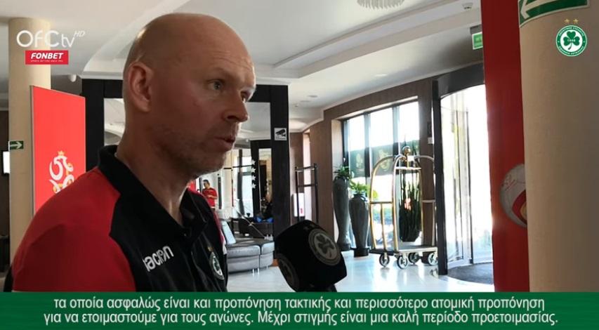 "Είμαι χαρούμενος που έχω την ευκαιρία να δουλέψω με τους ποδοσφαιριστές μου. Βέβαια, είχαι παρακολουθήσει βίντεο με παλαιότερα παιχνίδια, όμως τώρα έχω την ευκαιρία να δουλέψω μαζί τους, να τους δω στις προπονήσεις και τους αγώνες. Μπορούμε να δουλέψουμε το δικό μας παιχνίδι για να βελτιώσουμε τακτικά την ομάδα σε σχέση με το πως θέλουμε να αγωνιζόμαστε, όπως και να δουλέψουμε ατομικά. Είναι μία φυσιολογική προετοιμασία και είμαι χαρούμενος που έχουμε αυτόν τον χρόνο διότι είναι πιο εύκολο για ένα νέο προπονητή , να αναλαμβάνει πριν αρχίσει η σεζόν. Οι πρώτες εβδομάδες κύλησαν στο να θέσουμε τις βάσεις στη φυσική κατάσταση. Υπήρχε μεγάλη διακοπή για την ομάδα, έτσι κάναμε κάποια τεστ. Μετά αρχίσαμε τις κινήσεις μας στο γήπεδο σε ένταση και ταχύτητα. Ήταν μία καλή περίοδος προετοιμασια. Η φυσική μας κατάσταση είναι σε καλύτερο επίπεδο. Έχουμε νέους ποδοσφαιριστές στην ομάδα, πρέπει να κατανοήσουν το πως αγωνιζόμαστε. Αμυντικά δεν θα είνναι μεγάλη η διαφορά, ωστόσο επιθετικά θα έχουμε κάποιες διαφοροποιήσεις. Σε αυτό δουλεύουμε... Ευχόμαστε να τελειώσουμε τη χρονιά σε ψηλό επίπεδο σε σχέση με το που βρισκόμαστε τώρα. Είναι ένας καλό οργανωμένος σύλογος, όλοι γνωρίζουν τα καθήκοντα τους. Η προετοιμασία είναι μία δύσκολη προετοιμασία, οι παίκτες φορτώνονται ιδιαίτερα. Όλοι δείχνουν θετική συμπεριφορά στην προπόνηση. Είμαι χαρούμενος για το επίπεδο που βρισκόμαστε τώρα, ανυπομονούμε για το ξεκίνημα της σεζόν. Εύχομαι οι φίλαθλοι να βοηθήσουν και να υποστηρίξουν την ομάδα, βέβαια θα πρέπει αυτό που θα δουν να τους αρέσει. Δουλειά μας είναι να τους αρέσει αυτό που θα δουν στο γήπεδο. Να παίζουμε με πάθος, ένταση , καλό τέμπο, να παλεύουμε για κάθε μπαλιά, να παίζουμε επιθετικά, να σκοράρουμε, να ψάχνουμε τη νίκη σε κάθε ματς"
