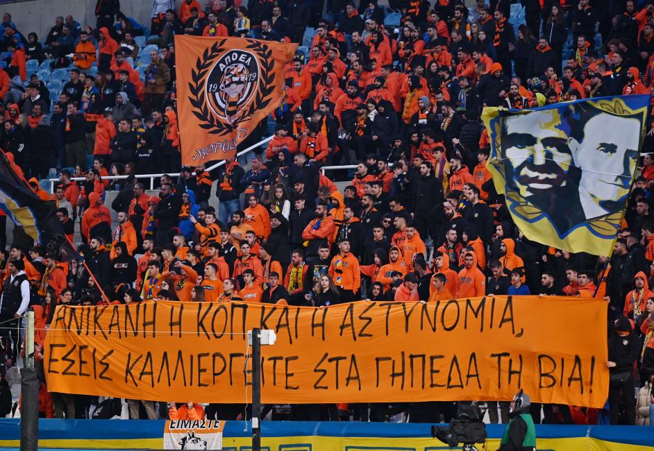 Πανό αντίδρασης από τους φίλους του ΑΠΟΕΛ στη νότια εξέδρα του ΓΣΠ, εκφράζοντας έτσι την άποψη τους για το μέτρο της ΚΟΠ σχετικά με την γενική απαγόρευση παρουσίας φιλάθλων των φιλοξενούμενων ομάδων.