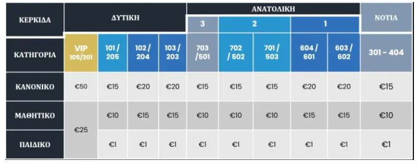 Τονίζεται ότι στους τομείς της δυτικής και ανατολικής εξέδρας ισχύει η ταξιθεσία και ως εκ τούτου καλείται το φίλαθλο κοινό όπως πάρει τη θέση την οποία αναγράφεται στο εισιτήριό του.