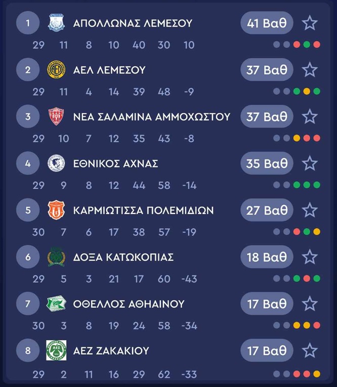 Στο Αμμόχωστος, η Καρμιώτισσα επικράτησε με 1-2 του Οθέλλου και με 27 βαθμούς ξέφυγε από τις τρεις τελευταίες θέσεις της βαθμολογίας. Από την άλλη, ο Οθέλλος έμεινε στην τελευταία θέση (μαζί με ΑΕΖ) έχοντας 17 βαθμούς και είναι με το ενάμιση πόδι στην δεύτερη κατηγορία.