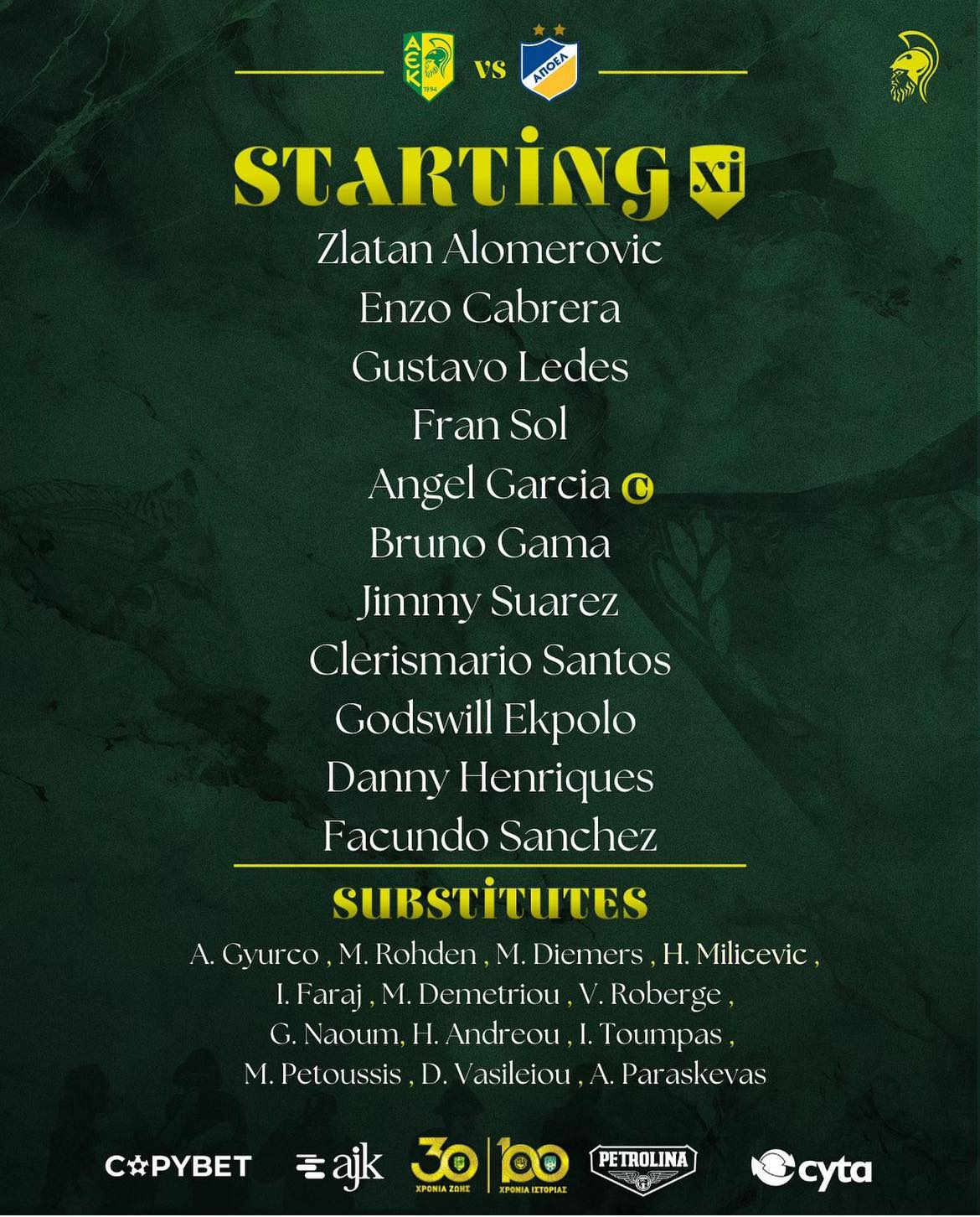Στις 19:00 ΑΕΚ και ΑΠΟΕΛ κοντράρονται σ' ένα δυνατό φιλικό πριν την έναρξη των ευρωπαϊκών τους υποχρεώσεων την ερχόμενη εβδομάδα. Δείτε τις επιλογές του Χουάν Φεράντο για τη σημερινή αναμέτρηση.