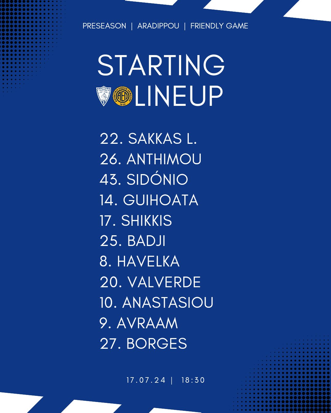 Ομόνοια Αρ.: Η εντεκάδα για το φιλικό με ΑΕΛ Α' ΚΑΤΗΓΟΡΙΑ ΟΜΟΝΟΙΑ ΑΡΑΔΙΠΠΟΥ Άντρια Χήρα 17.07.202418:08 Η ενδεκάδα της Ομόνοιας Αρ. για τον φιλικό αγώνα απέναντι στην ΑΕΛ Λεμεσού. Το ματς αρχίζει στις 18:30. gssnylvwmaatyvm.jpg