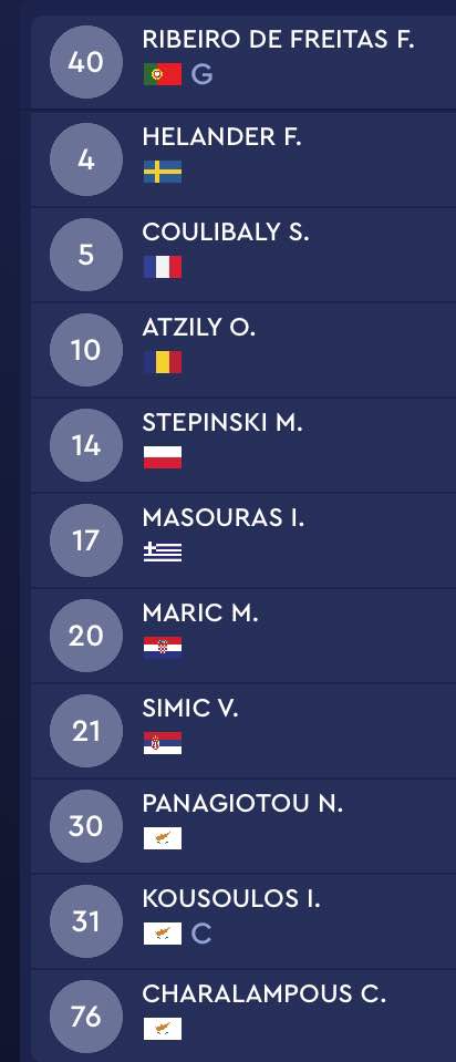 Φαμπιάνο, Ελάντερ, Κουλιμπαλί, Ατζίλι, Στεπίνσκι, Μασούρας, Μάριτς, Σίμιτς, Παναγιώτου, Κούσουλος, Χαραλάμπους.