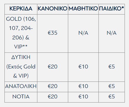 ** Εισιτήρια στα VIP εκδίδονται μόνο για μέλη του ΓΣΠ