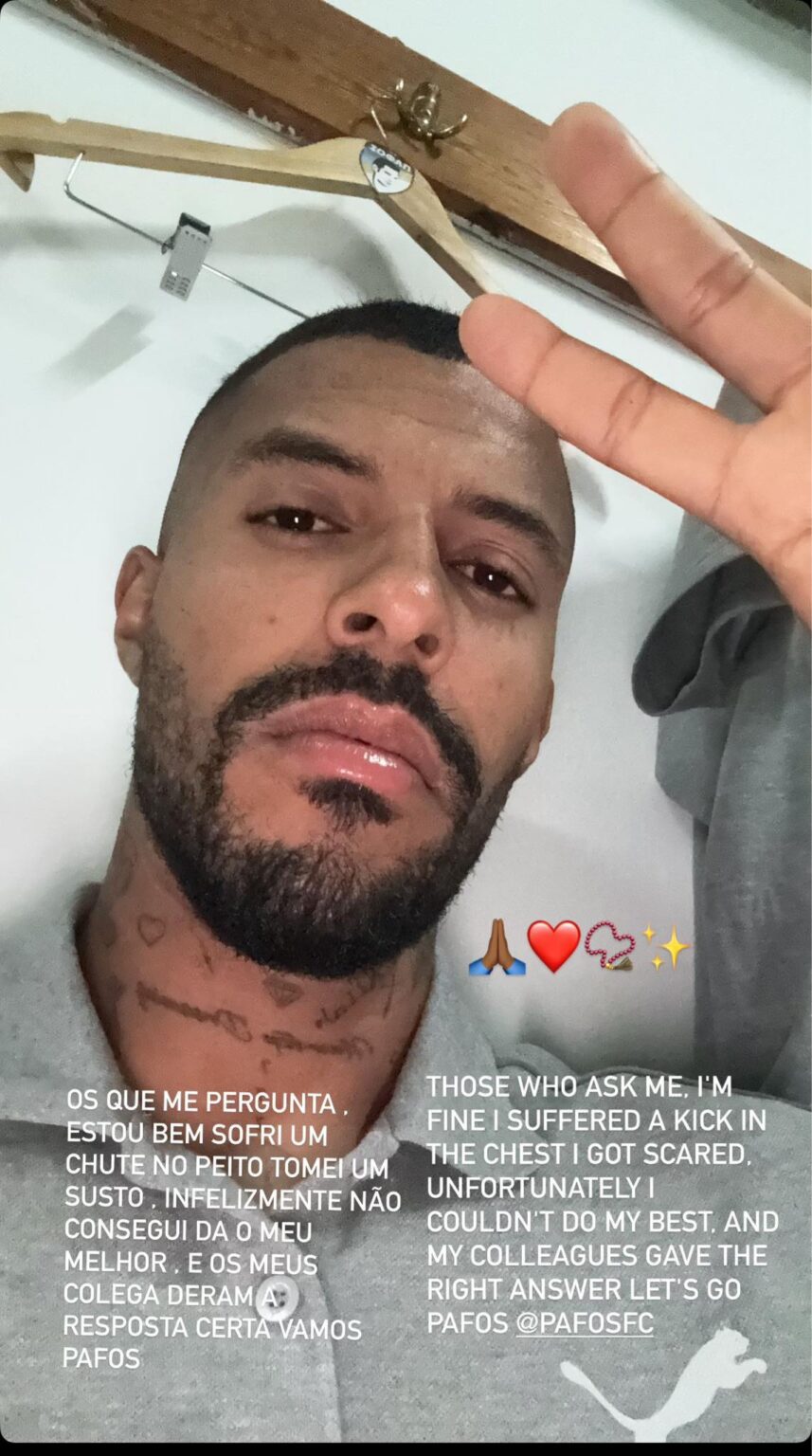 «Για αυτούς που με ρωτούν, είμαι καλά, με κλώτσησαν στο στήθος και τρόμαξα. Δυστυχώς δεν μπόρεσα να το δώσω τον καλύτερό μου εαυτό. Οι συμπαίκτες μου όμως φρόντισαν να δώσουν την καλύτερη απάντηση. Πάμε Πάφος…», έγραψε χαρακτηριστικά.