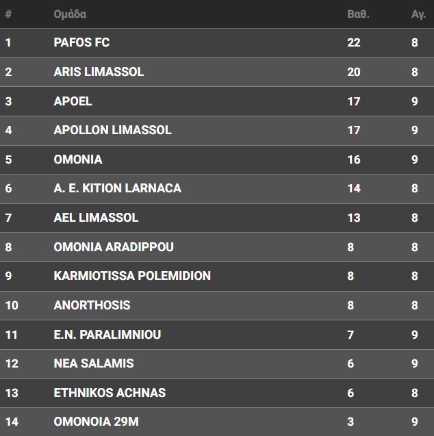 Η αγωνιστική ολοκληρώνεται αύριο (4/11) με τον αγώνα Ανόρθωση - ΑΕΛ στο «ΠΑΠ» (19:00).