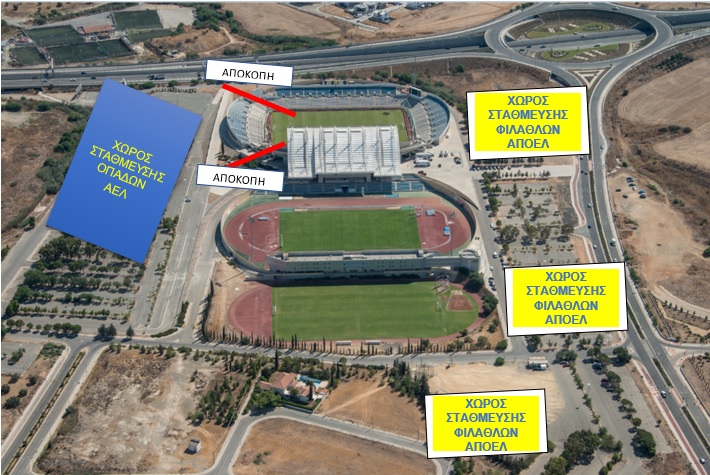 Οι φίλαθλοι του ΑΠΟΕΛ θα καταλάβουν τις Δυτικές, Ανατολικές και Νότιες κερκίδες του Σταδίου, ως εκ τούτου, προτρέπονται να κατευθυνθούν στο Στάδιο μέσω του κυκλικού κόμβου του Γ.Σ.Π. και της Λεωφόρου Ανεξαρτησίας. Να σταθμεύσουν τα οχήματα τους στον Δυτικό και Νότιο χώρο στάθμευσης οχημάτων.