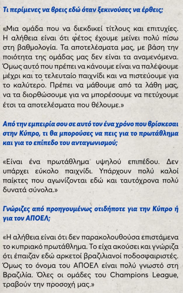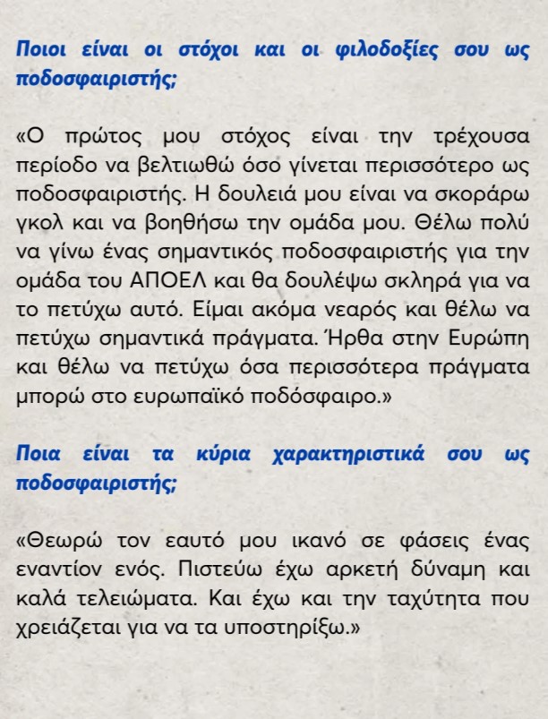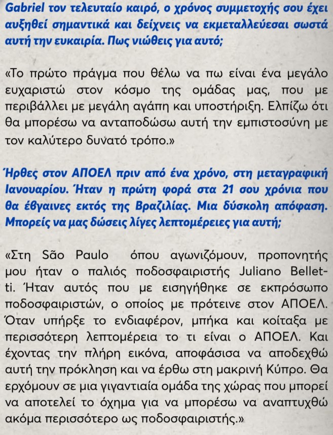 Ο Γκάμπριελ Μαϊόλι μίλησε στο επίσημο πρόγραμμα αγώνα του ΑΠΟΕΛ με τον Απόλλωνα. Τι είπε για το χρόνο συμμετοχής του που έχει αυξηθεί, την Κύπρο, τους στόχους του και το μήνυμα που έστειλε στον κόσμο των γαλαζοκιτρίνων.