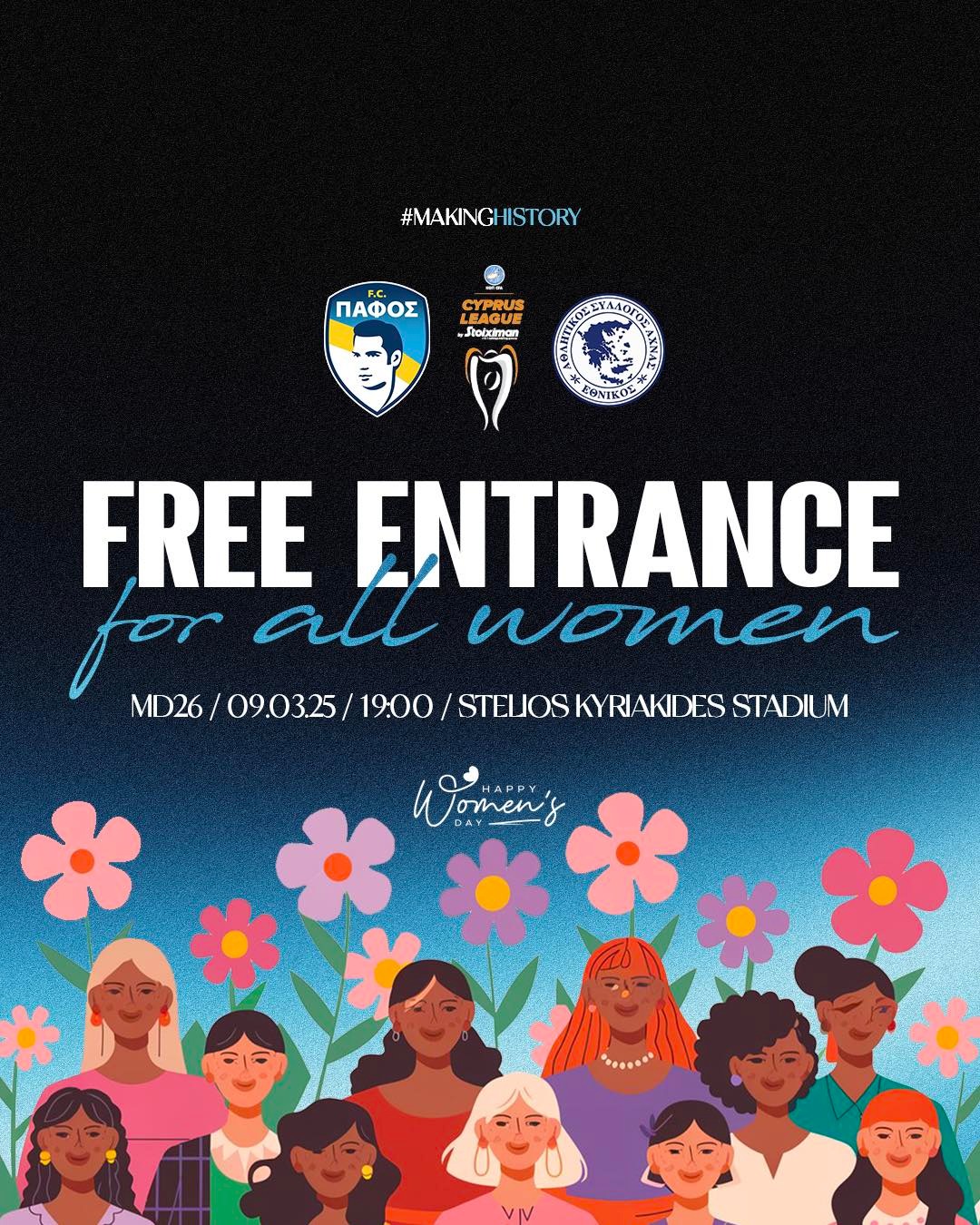 Οι γυναίκες μπορούν να προμηθευτούν το δωρεάν εισιτήριό τους ΜΟΝΟ από το Blue Store στο Kings Avenue Mall και από τα εκδοτήρια του σταδίου την ημέρα του αγώνα.