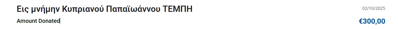 Συγκινητική πράξη και σήμερα στην πλατφόρμα οικονομικής ενίσχυσης για σωτηρία της Ανόρθωσης. Εις μνήμην του Κυπριανού Παπαϊωάννου που έχασε τη ζωή του στην τραγωδία των Τεμπών, κατατέθηκε το ποσό των 300 ευρώ. Στο 22% του στόχου και στις 421 χιλιάδες το ποσό που μαζεύτηκε μέχρι στιγμής για την επόμενη μέρα στην «Κυρία».