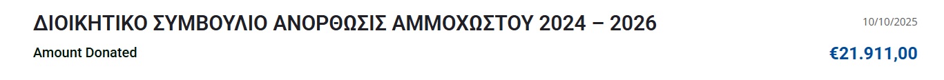 Οι εισφορές έφτασαν τις 512 χιλιάδες μετά από 1683 εισφορές με το ποσοστό στο στόχο να φτάνει στο 27%. Σήμερα μάλιστα ήταν μεγάλη μέρα αφού δόθηκε το ποσό των €21.911,00 από το ΔΙΟΙΚΗΤΙΚΟ ΣΥΜΒΟΥΛΙΟ ΑΝΟΡΘΩΣΙΣ ΑΜΜΟΧΩΣΤΟΥ 2024 – 2026.