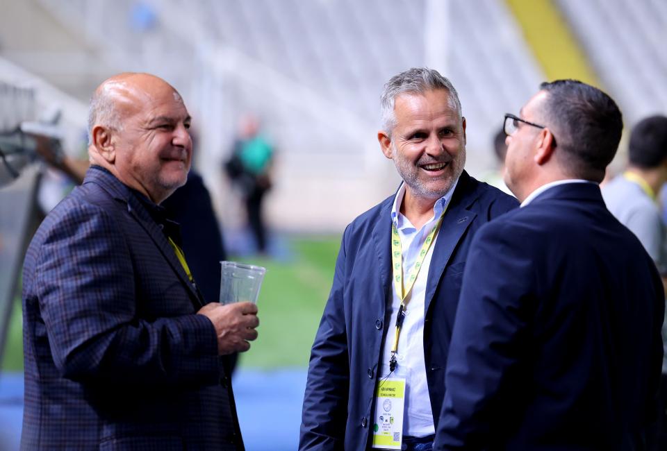 Ο πρόεδρος της ΑΕΚ, Άντρος Καραπατάκης και ο τεχνικός διευθυντής της ομάδας, Τσάβι Ρόκα, τα είπαν σε ένα ωραία πηγαδάκι με τον Γενικό Διευθυντή της Πάφος F.C, Χάρη Θεοχάρους. Ευδιάθετοι και με χαμόγελο οι τρεις άνδρες, πριν την τον αγώνα των ομάδων τους για το Σούπερ Καπ.
