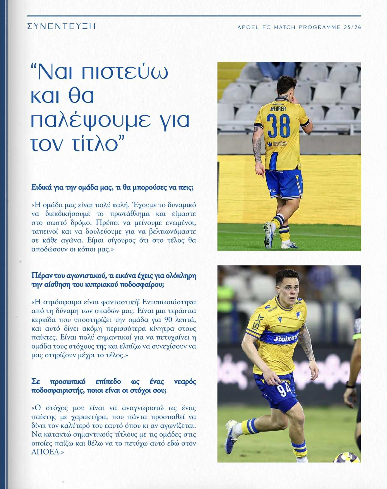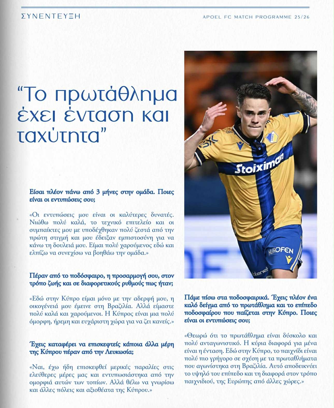 Εν όψει της εντός έδρας αναμέτρησης με τον Εθνικό Άχνας για την 9η αγωνιστική στη Cyprus League by Stoiximan ο ΑΠΟΕΛ κυκλοφόρησε το match-programm, το οποίο φιλοξενεί συνέντευξη του Ζιοβάνε Μέουρερ.