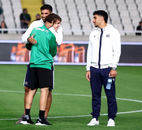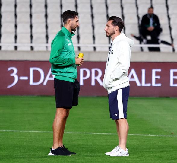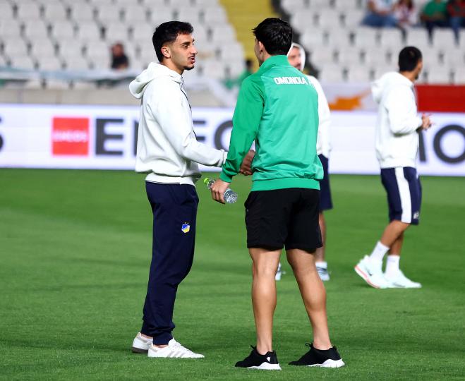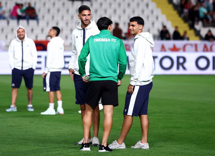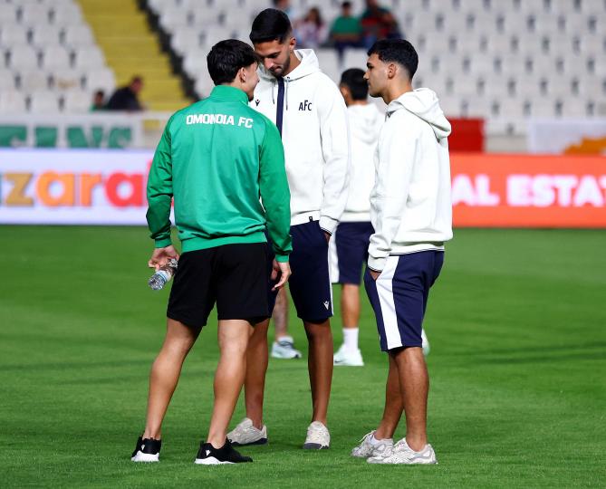 Την πρώτη τους βόλτα στον αγωνιστικό χώρο του ΓΣΠ, έκαναν μιάμιση ώρα πριν την έναρξη του ντέρμπι Ομόνοια-ΑΠΟΕΛ οι ποδοσφαιριστές των δύο ομάδων. Συζητήσεις και χαμόγελα σε πολύ καλό κλίμα από τους παίκτες των δύο ομάδων.